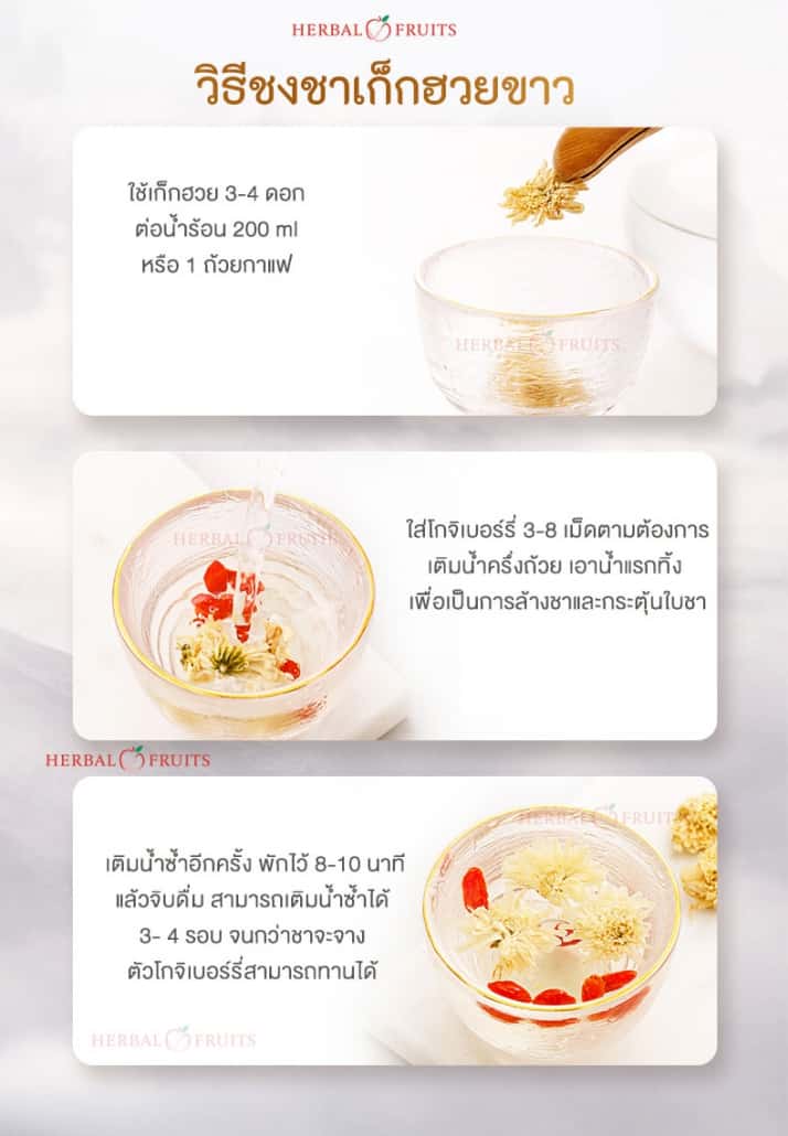 • ตักชาดอกเก๊กฮวยในปริมาณที่ต้องการ เทน้ำร้อนลงไป รอ 1-2 นาทีแล้วเทน้ำออก จากนั้นเทน้ำร้อนอีกครั้ง รอ 5 นาทีพร้อมดื่ม